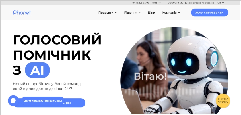 Голосовий помічник Phonet допоможе оптимізувати рутинні завдання у спілкуванні з клієнтами. Він працює на базі сучасних моделей штучного інтелекту: TTS (Text-to-Speech) - перетворює текст на природну мову з інтонацією; STT (Speech-to-Text) – розпізнає голос клієнта у реальному часі; LLM (модель розуміння мови) – веде діалог, адаптується, уточнює запити. Він може автоматично відповісти на дзвінок клієнта, відповісти на запитання, що часто ставляться (графік, адреса, ціна, послуги), записати клієнта на прийом або бронювання, перенести або скасувати зустріч, зафіксувати інформацію у вашому CRM, переадресувати виклик, якщо запит складний. Асистент стане в нагоді для сервісних бізнесів (готелів, ресторанів, салонів краси, лікарень тощо), а також там, де багато комунікацій, що повторюються, у спілкуванні з клієнтами, партнерами або підрядниками. Вартість використання AI помічника – 9,15 грн/хв.