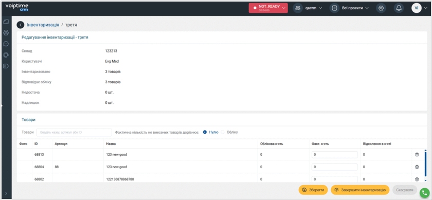 Вийшло чергове оновлення системи VoIPTime CRM. Серед ключових нововведень – нова інтеграція з e-commerce плагіном для WordPress – WooCommerce. Всі нові заявки після підключення інтеграції автоматично надходять до CRM. Імпорт товарів з WooCommerce у CRM здійснюється з пошуком за артикулом; за відсутності збігів створюються нові товари. Можна настроїти переходи статусів, типи оплати та категорії між CRM та WooCommerce. Також додано можливість ручної інвентаризації складу. Товари для інвентаризації можна додавати вручну – вони відображаються у вигляді таблиці з обліковою кількістю, фактичною кількістю (яку вводить користувач) та різницею між ними. Під час інвентаризації доступний зручний віджет, що показує загальну кількість товарів, збіг з урахуванням, а також нестачу та надлишок.